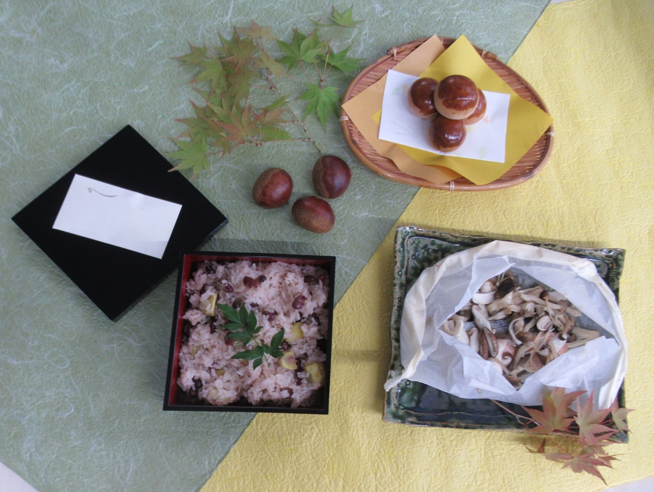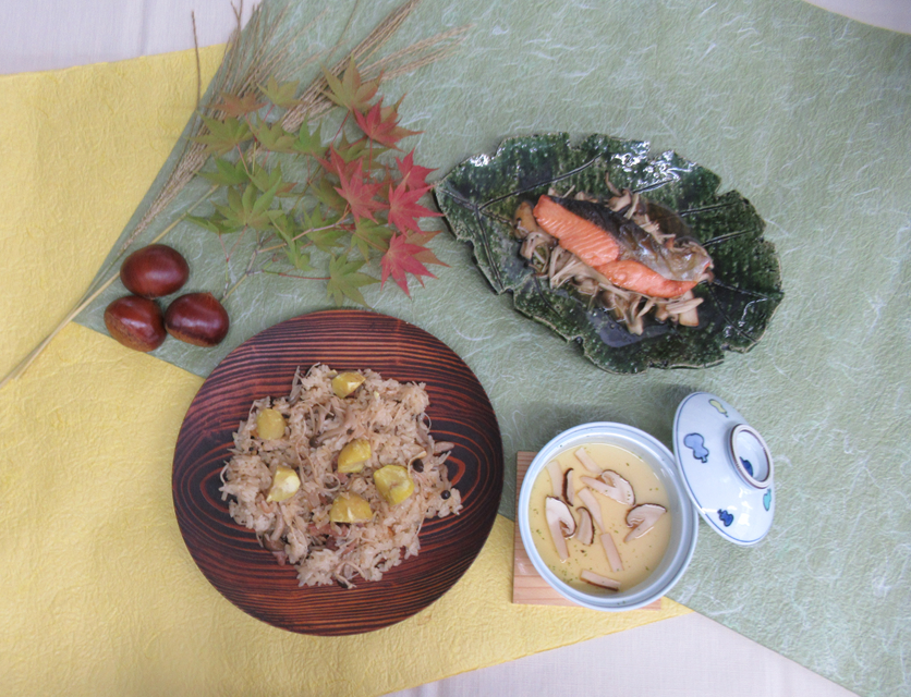 秋の吹き寄せごはん、魚の山芋蒸し、柿なます